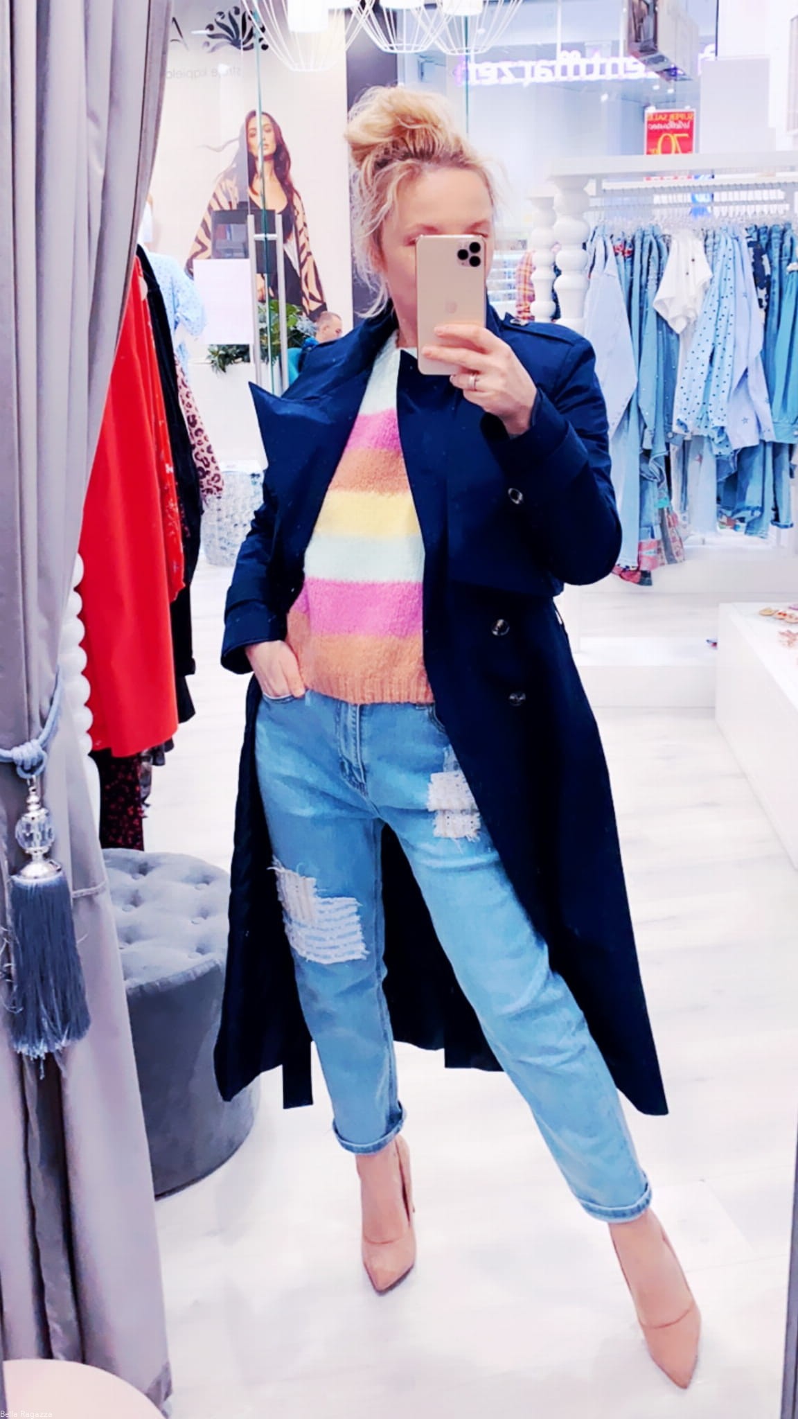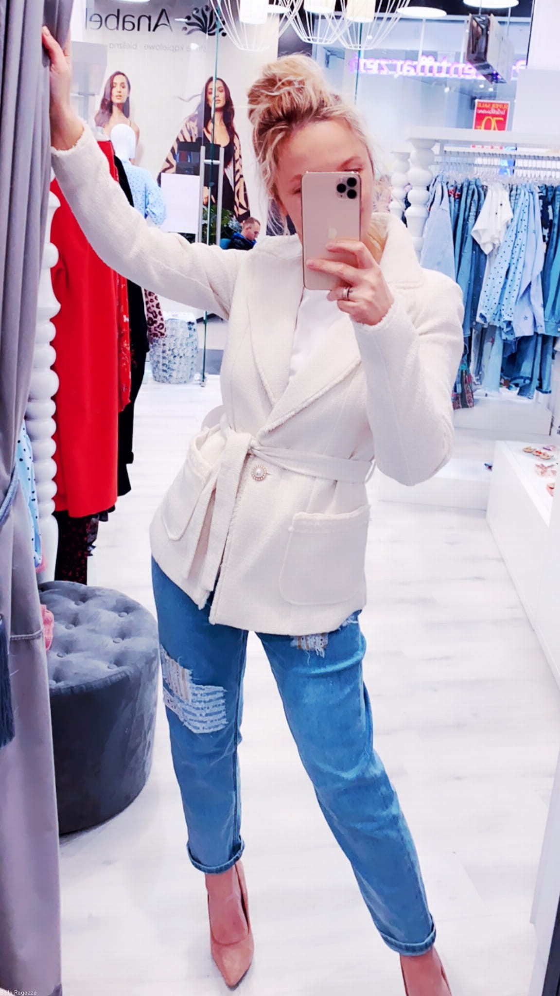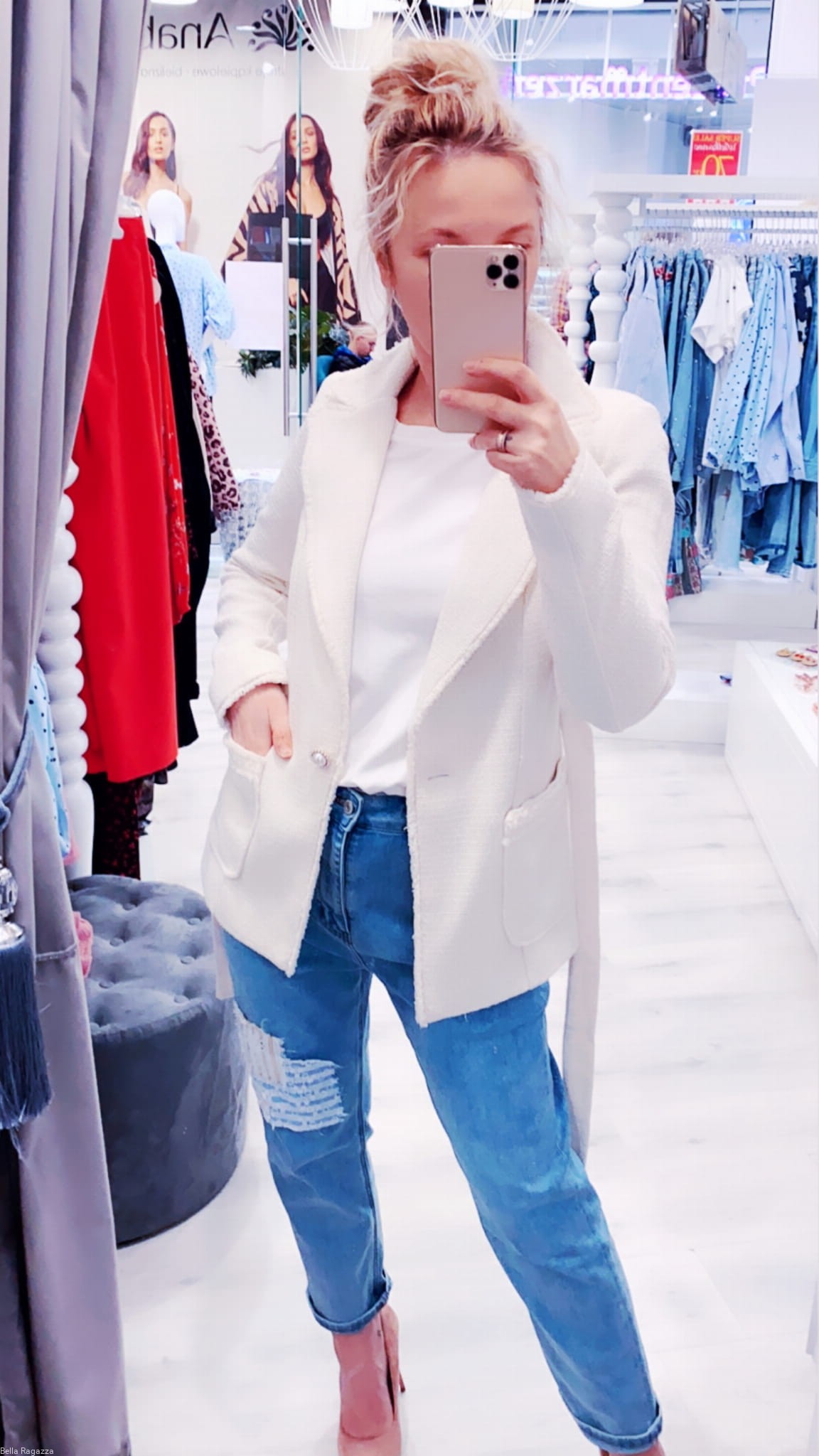 - Modelka blondynka nosi rozmiar XS/S i ma na sobie XS
