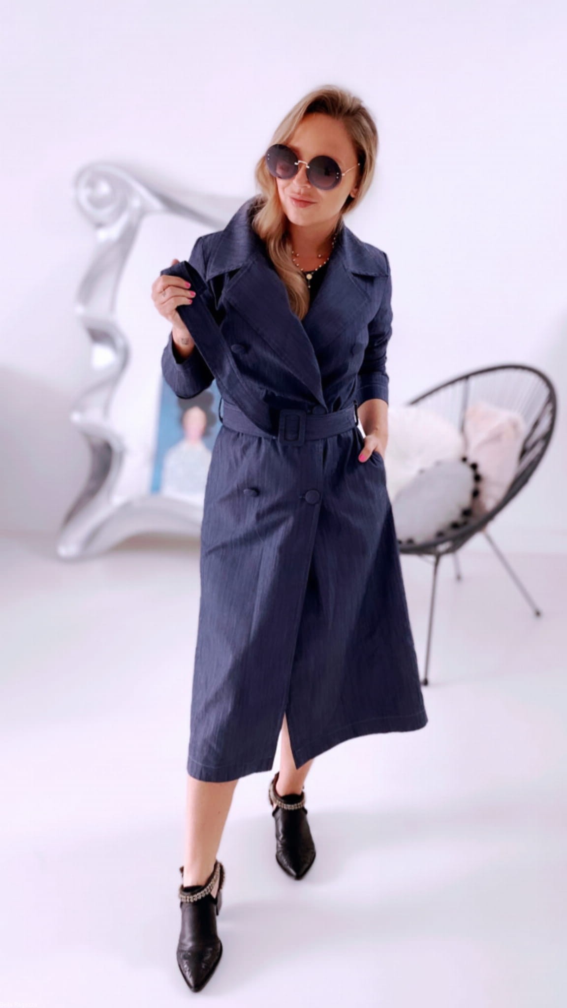 - Płaszcz z dużym kołnierzem oraz dwurzędowym zapięciem