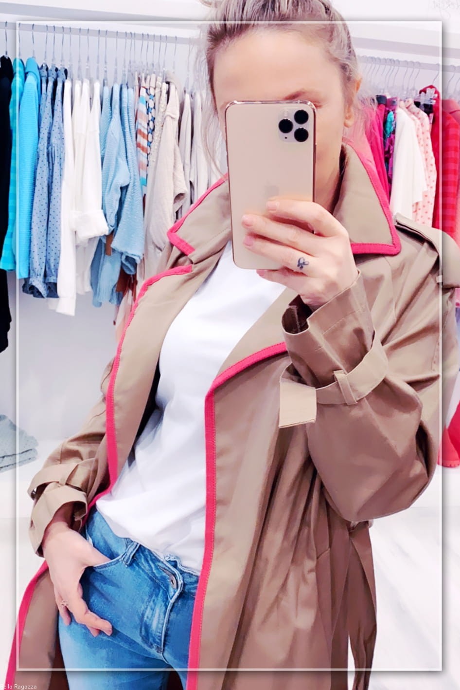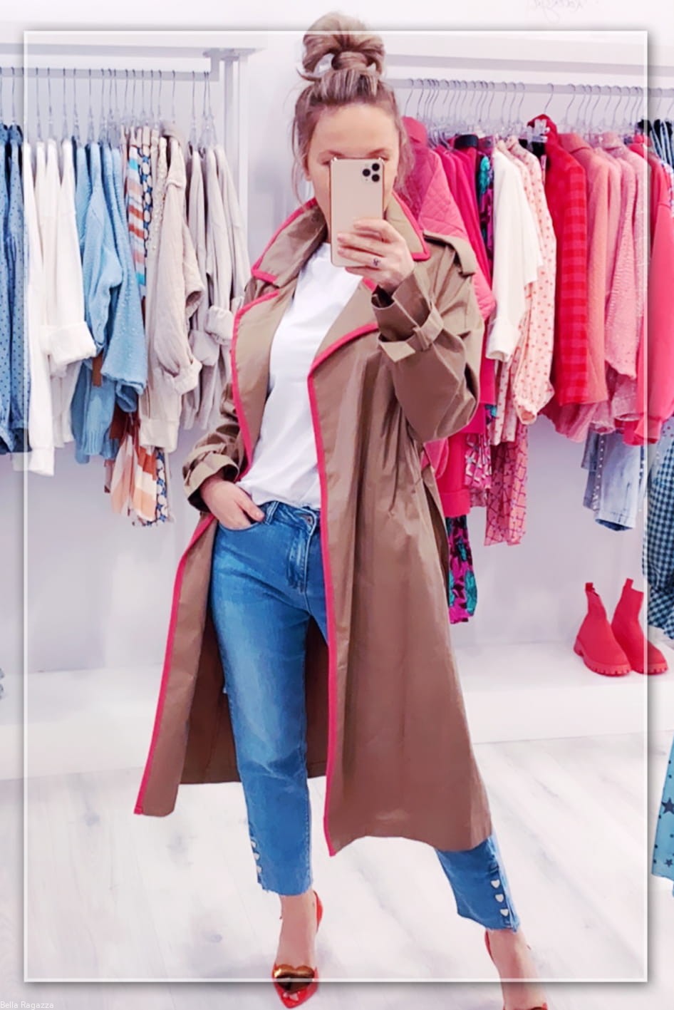 - Beżowy trencz zapinany na ozdobne guziki