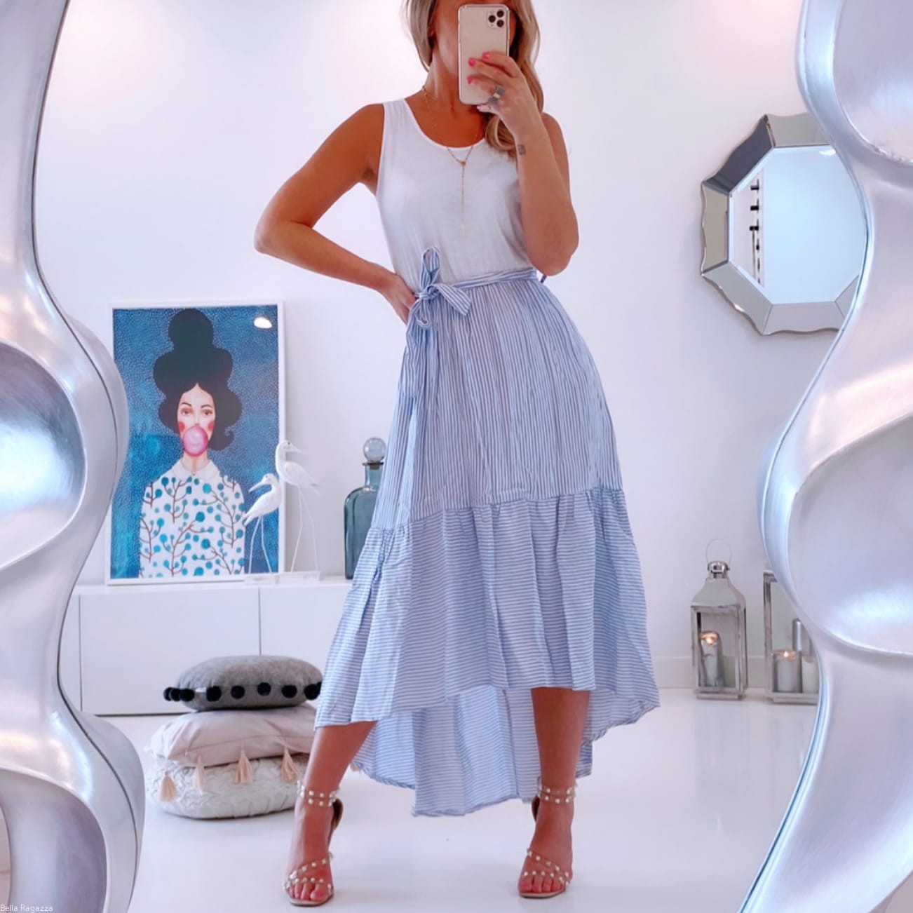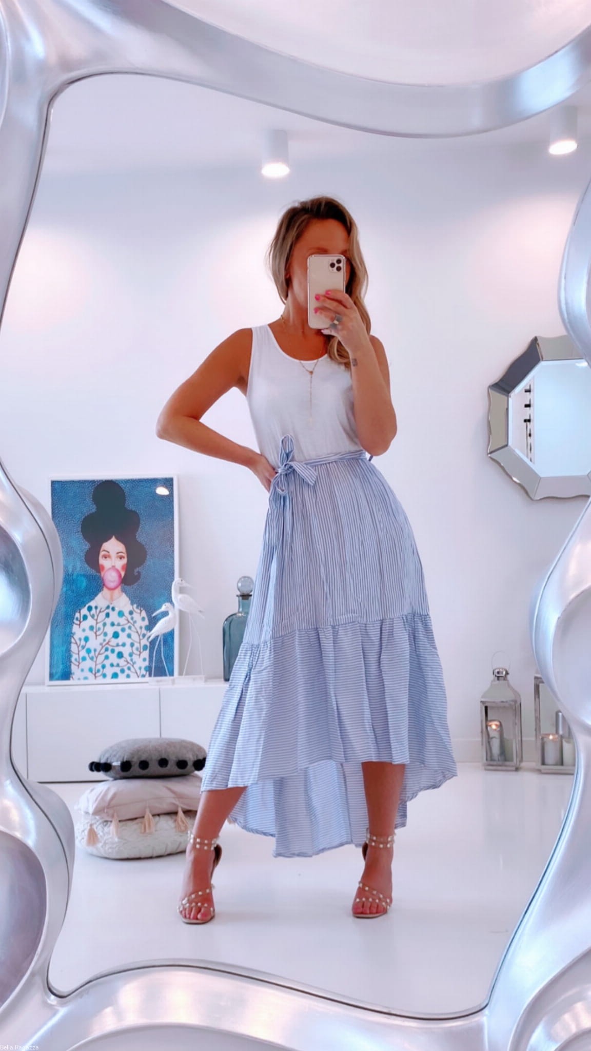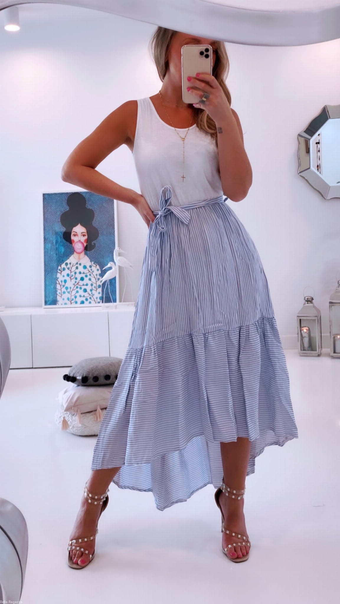 - Dół w paski wykończony falbaną